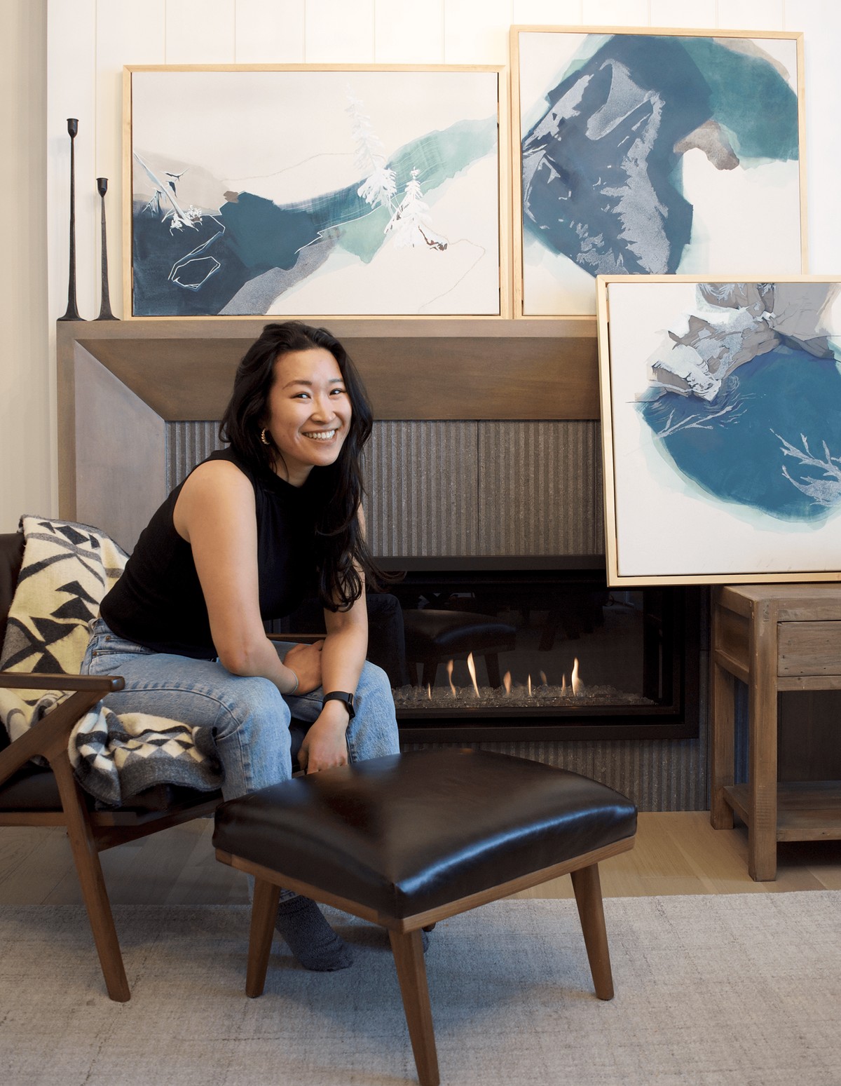 Jamie’s creative process begins outdoors, hiking new trails and absorbing nature’s essence. Using raw canvas and mixed media, she captures central colours and organic forms, creating contemporary works that feel both modern and deeply rooted in the natural world.