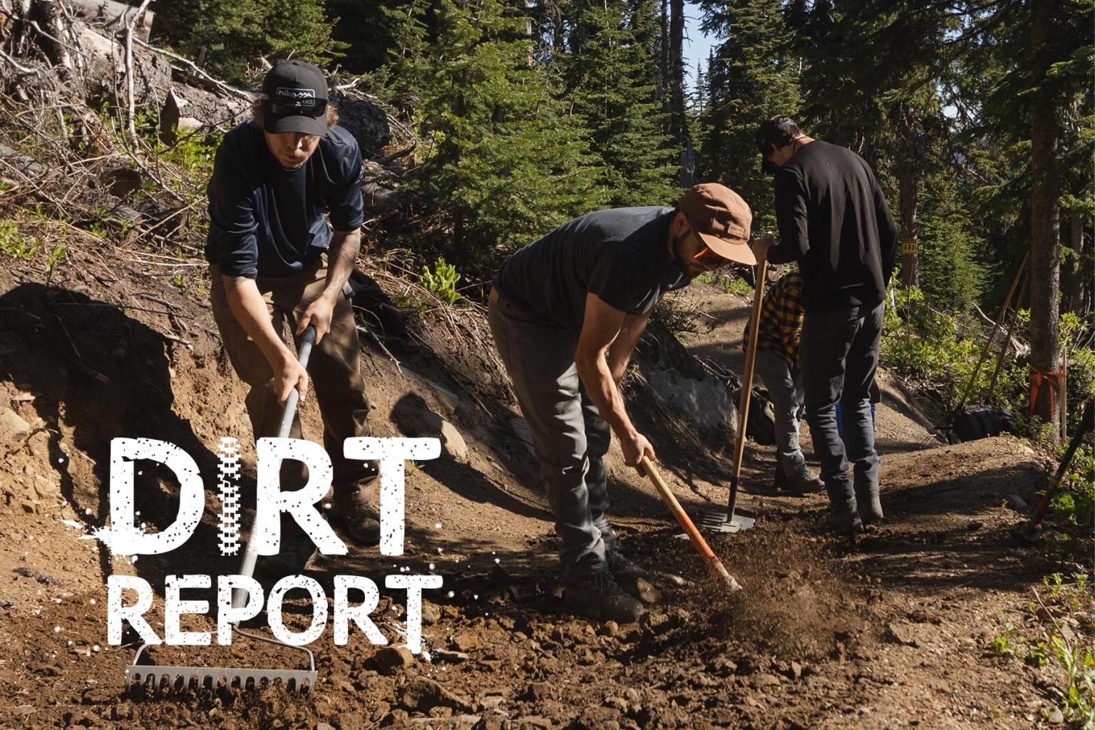 Trail Crew doing trailwork, with Dirt Report logo