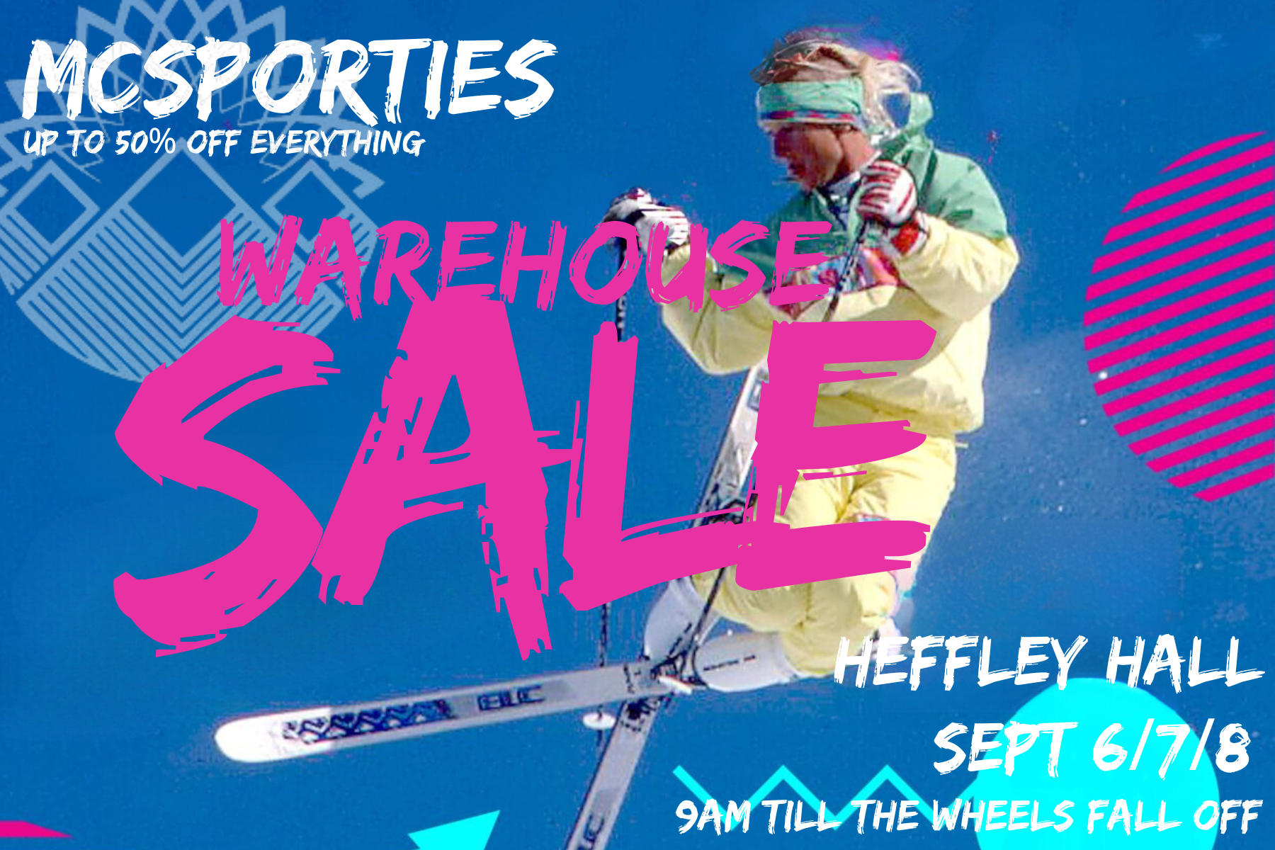 Whether you're shredin' slopes or tearing up trails, don't miss the annual McSporties Warehouse Sale at Heffley Hall. Offering unbeatable deals on the latest ski and bike products, summer and winter apparel, touring, protective gear and more; we're guaranteed to have you equipped for your next adventure! If you're hungry for more than savings, check out the on-site food trucks Saturday and Sunday!