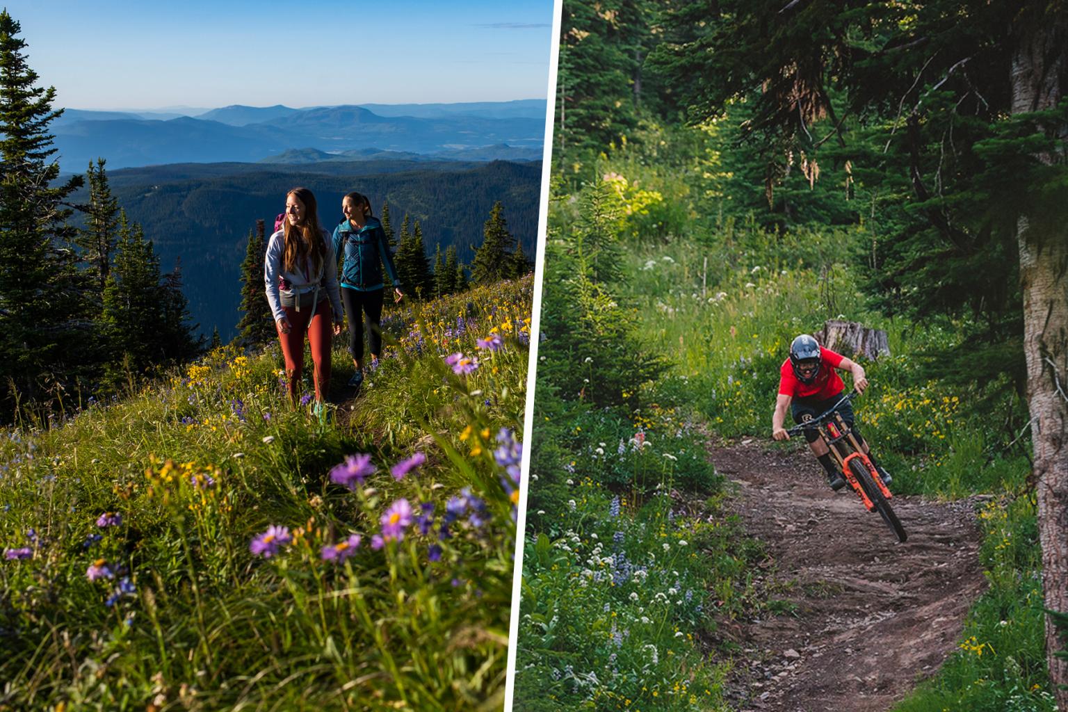 Mountain biker on trail, hikers walking amidst wildflowers.