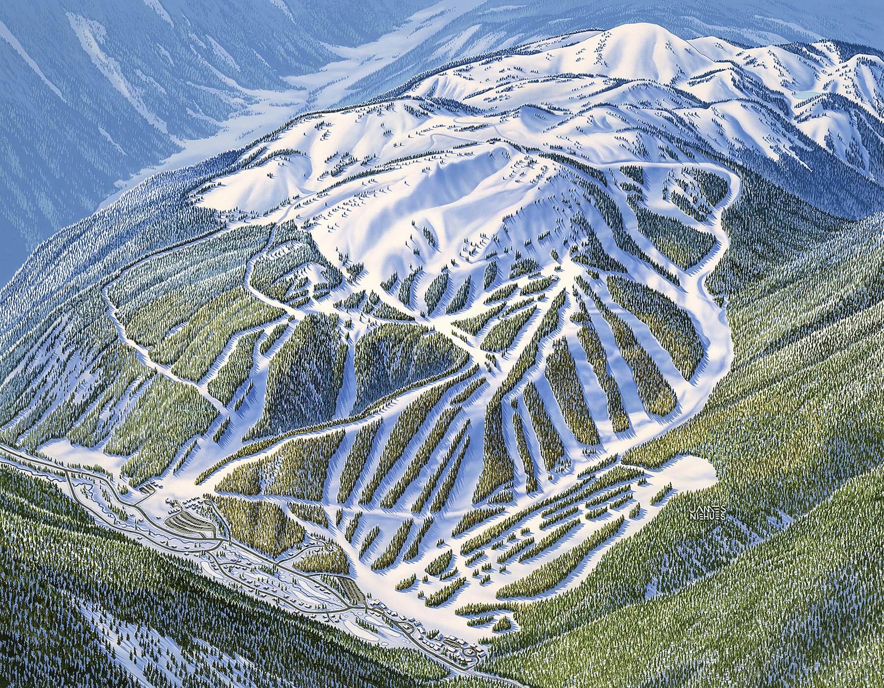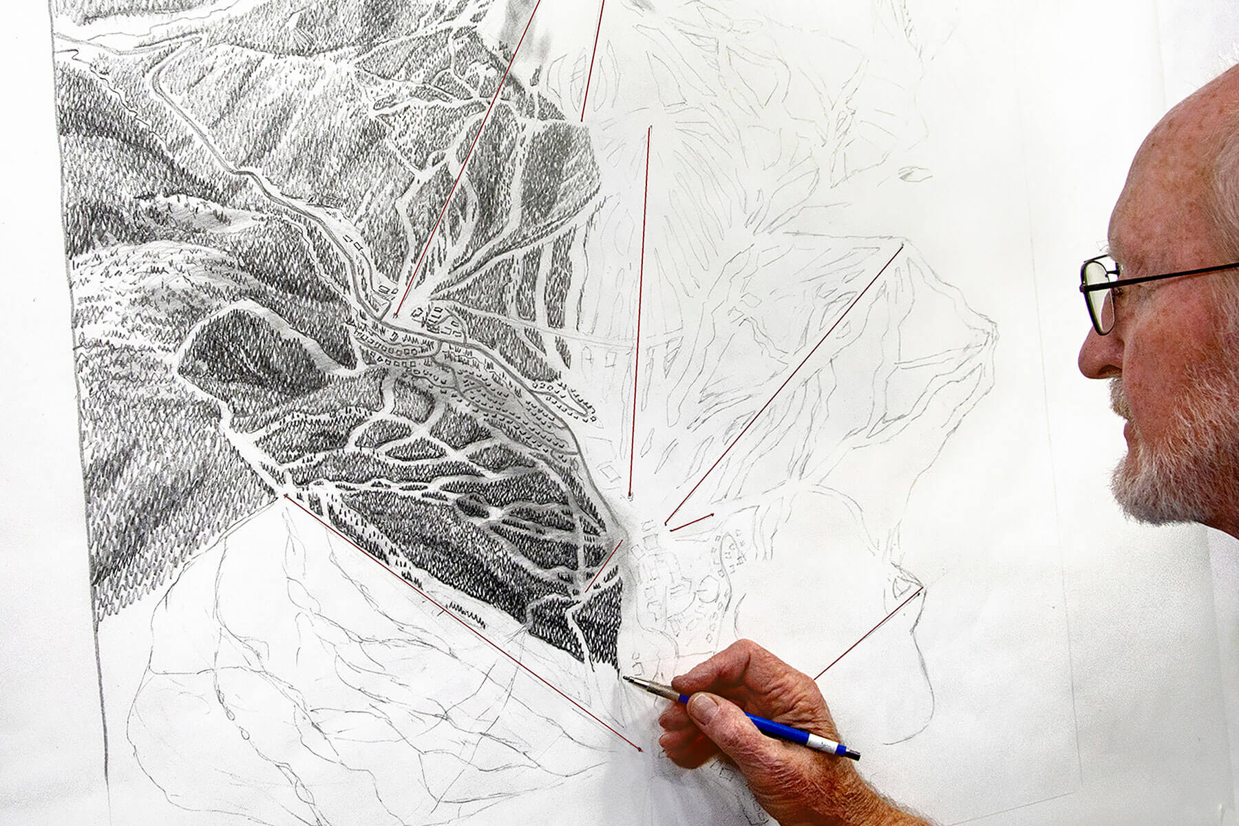 Keen eyed skiers and snowboarders who joined us on the slopes this past season will have noticed that we introduced a brand new trail map, proudly displayed around the resort for winter 2019/20. While our previous map served us well for years, terrain expansions, new lifts, and other changes around the resort meant that it was time for a fresh look on Canada’s second largest ski area. With the decision made to update the map, there was only one person we trusted to continue bringing our three peaks to life: legendary trail map artist James Niehues.
