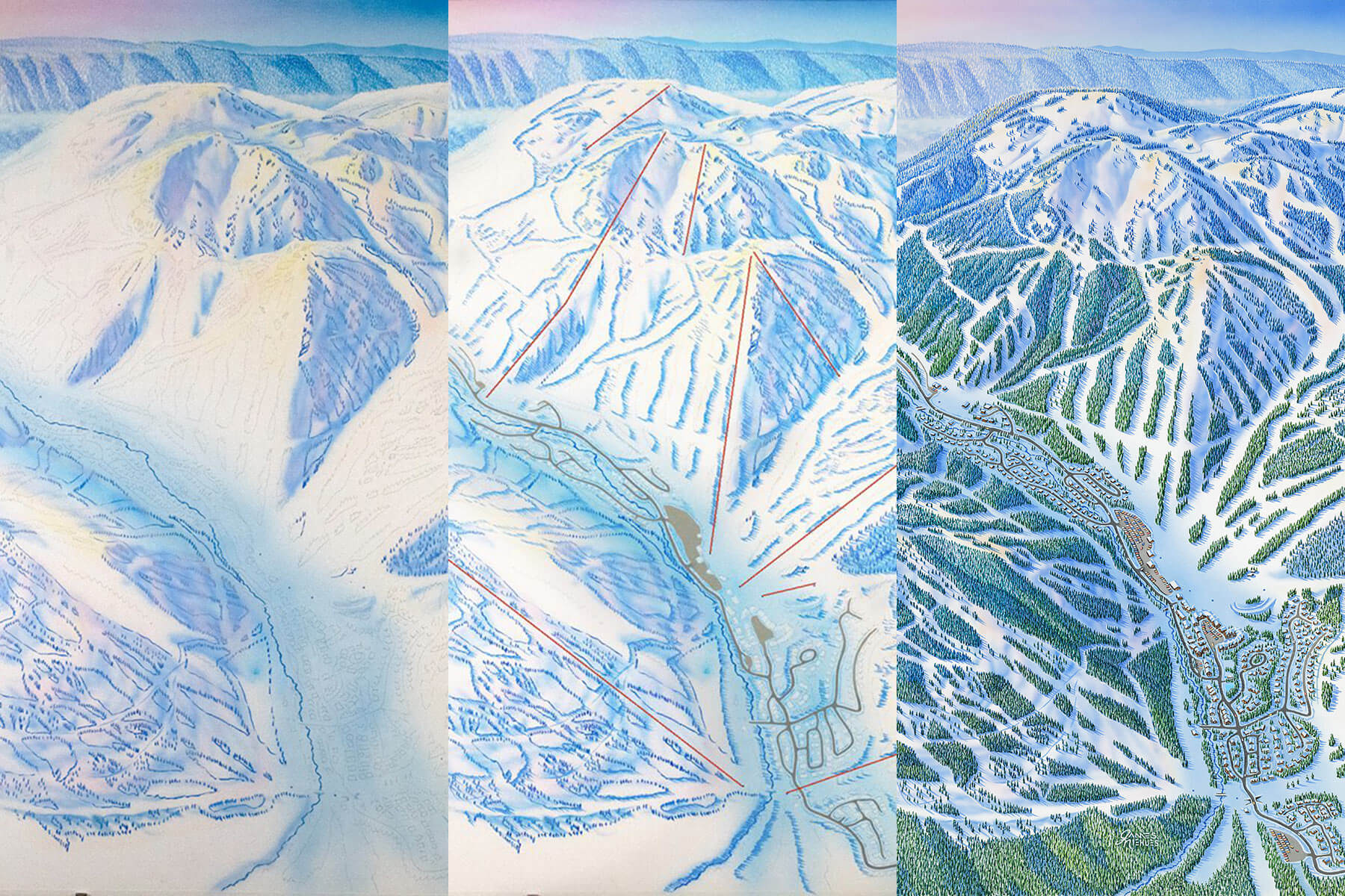 Once the photos were complete, it was over to the piste Picasso to work his magic. Niehues has enjoyed the challenge presented by painting Sun Peaks over the years, describing it as the most difficult trail map in the lineup of almost 200 resorts that he’s worked with.