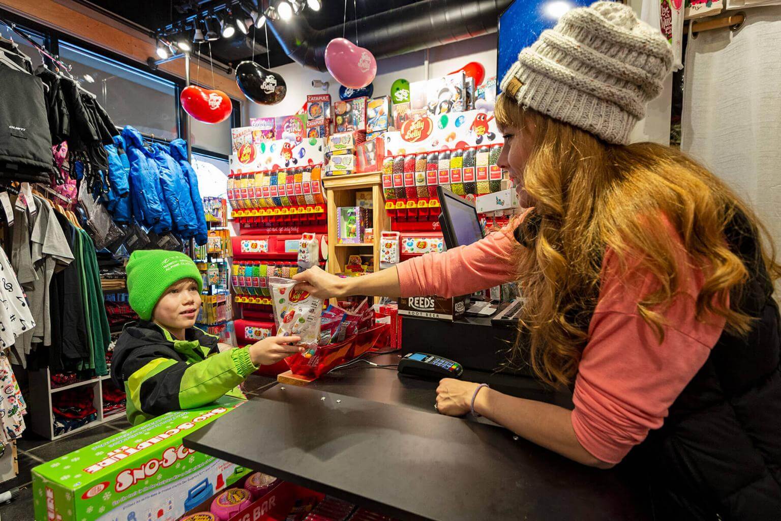 You can find official Sun Peaks gear, like hoodies, beanies, and more, at John Tod Trading Co. and other local retailers in the village.
