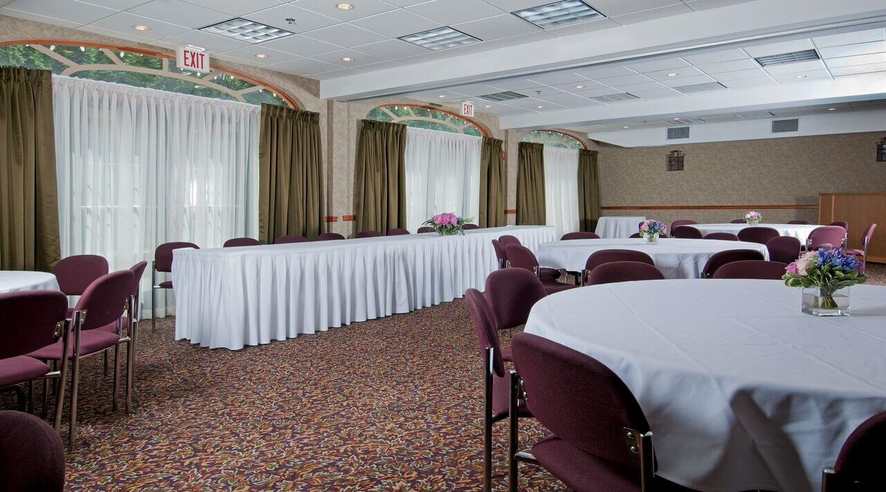 Spacious meeting room with carpet, large windows, and wooden accents.
