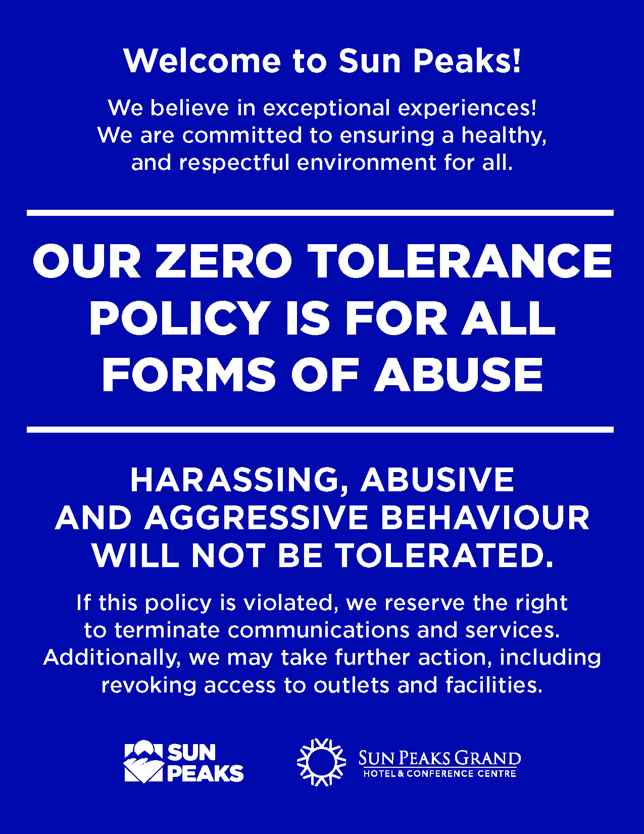 We are committed to ensuring a healthy, respectful, and safe environment for all our guests and staff. To support this experience, we expect our guests and staff to follow our Zero Tolerance Policy, Alpine Responsibility Code, and Cross-Country Responsibility Code.